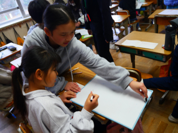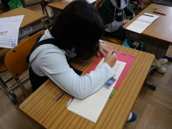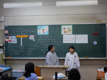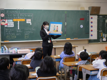 •  3年生の道徳の時間、「ボールのきまり」という教材を使って、きまりの大切さについて学びました。登場人物の行動に着目して、自分だったらどんな行動をしていたかを想像し、その理由を考えました。教材文では、最初はきまりを守っていなかった人物が、きまりを守る行動に変化していく中で、自分も周囲も気持ちよく過ごせることに気づいていきました。行動の変化を考える途中で、隣の友達と相談し、自分の考えから隣の友達と一緒に考えた行動を全体に発表しました。友達に説明し、友達の考えを聞くことで自分なりの考えを深めることができました。