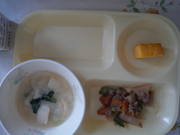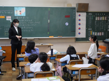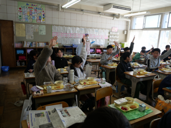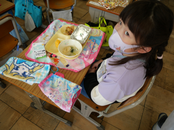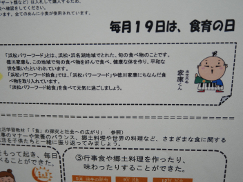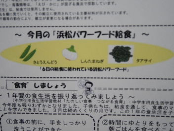 •  今日は、「ふるさと給食の日・浜松パワーフード給食の日」です。「ふるさと給食の日」には、静岡県内や浜松市内でとれる農産物・海産物を給食に使っています。その中でも、浜松・浜名湖地域でとれた旬の食べ物を「浜松パワーフード」としています。今日の「浜松パワーフード」は、新たまねぎ・さやえんどう・タアサイです。1年生の子供たちも地域の産物の味を楽しんで食べていました。