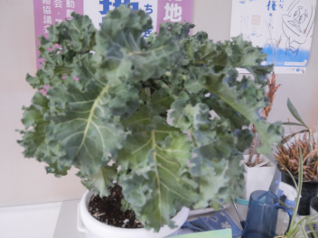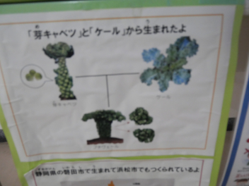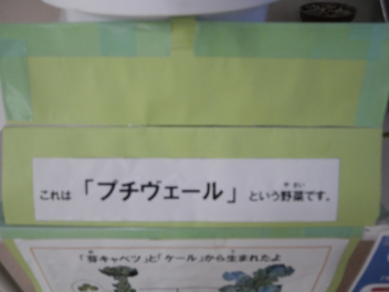 •  職員室前のスペースに浜松産野菜のプチヴエールが展示してあります。この野菜は、芽キャベツとケールの交配からつくられたプチヴェール。フランス語で「小さな緑」という意味を持つ、日本で生まれたアブラナ科の野菜です。苦みのあるケールからつくられていますが、味にクセがなく、加熱するとほんのり甘くなるのが特徴。緑のバラのような見た目で、食卓に華を添えます。プチヴェールの発祥地は、静岡県磐田市。旬は冬で、11~翌年3月にかけて収穫され、出回ります。給食にもキャベツはたくさん使われます。子供たちが野菜の生育に関心をもって食事をしてくれるといいですね。