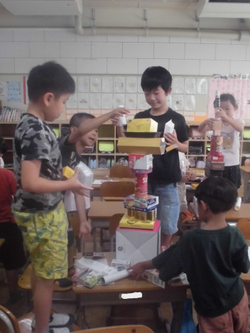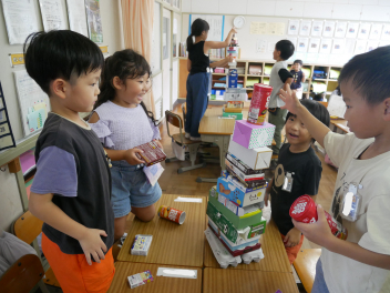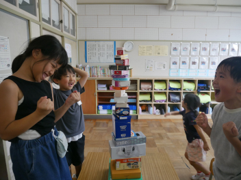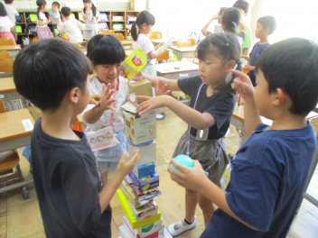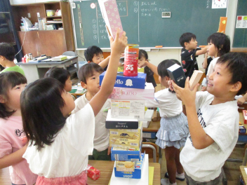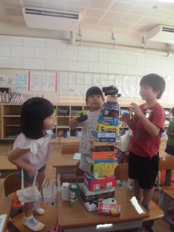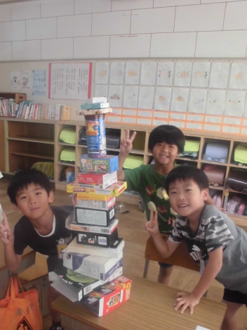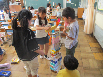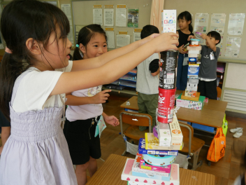 • 算数「かたちあそび」の学習で、箱を高く積む活動をしました。