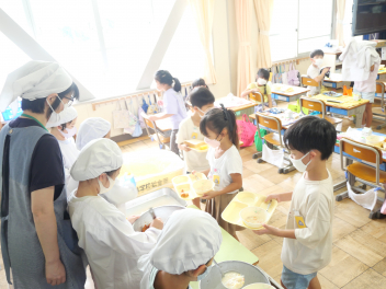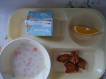 今日の給食は「世界の料理 アメリカ」でした。広大な土地、アメリカでは、国土の40パーセントを占める農地でさまざまな農作物を作っています。今日のメニュー「バッファーローチキン」は、鶏肉を揚げ、香辛料と酸味のきいた調味料で味付けしたアメリカの代表的な料理です。チャウダーとは、アメリカでは具だくさんのスープのことで、今日は、牛乳ベースのトウモロコシの甘みがおいしい「コーンチャウダー」でした。