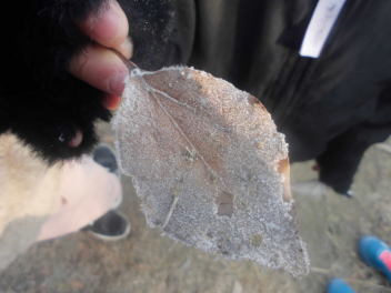 遊具の方へ行き、葉っぱに霜が付いているのをたくさん見つけていました。