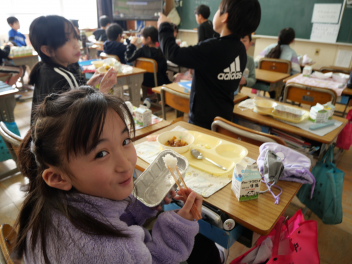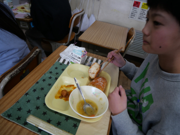 •  2月の献立のテーマは「寒さに負けない食べ物」です。体を温める栄養素には炭水化物やたんぱく質、脂肪があります。そしてビタミンAやビタミンCには病気に対する抵抗力を高める働きがあります。これらをバランスよく食べるためには、好き嫌いをしないことが大切です。しっかり食べて、寒い冬も元気に過ごしたいですね。今日は、パン・牛乳・鶏肉のクリーム煮、ポテトサラダ・ネーブルでした。ネーブルの原産地はブラジルです。静岡県はネーブルの生産量が日本一だそうです。子供たちは、ジューシーなネーブルをおいしそうにほお張っていました。