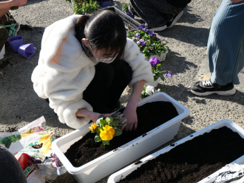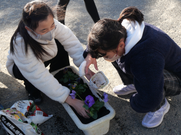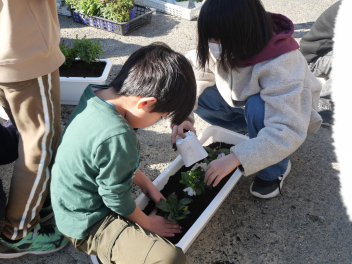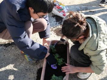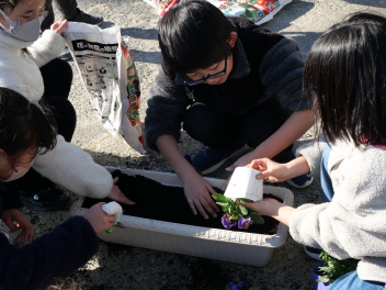 委員会活動の時間、園芸委員会の子供たちがプランターにビオラやパンジーの苗を植えました。ビオラとパンジーの花言葉は「もの思い」「私を思って」「思い出」です。うつむきがちに咲く花の姿が、人が物思いにふける様子や、片思いの少女の姿に似ていることから名付けられました。どちらも10月〜5月頃に咲く寒さに強い植物です。 委員会の子供たちの活動で和地小学校が花いっぱいの学校になるといいですね。