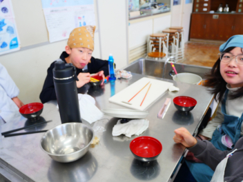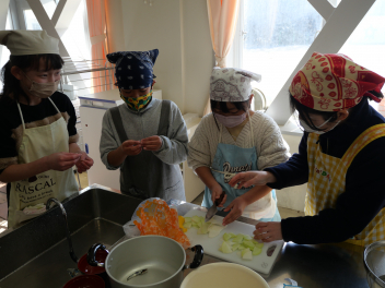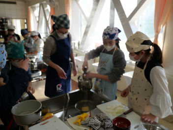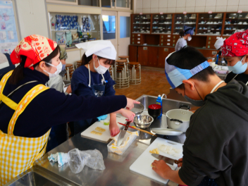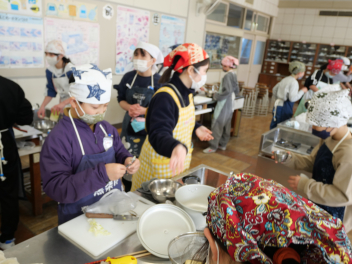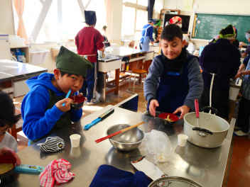 •  5年生の家庭科の時間、鰹節や煮干しを使って、だしを作り、みそ汁を作りました。最初に、煮干しは「頭と腹わた」を取ることで苦味がなくなり、きれいな色の出汁になりました。次に、いちょう切りにした大根は火が通りにくいので、先に入れました。 沸騰させると味噌の香りが飛んでしまうので沸騰しないように気を付けながら火を通しました。具材の切り方をそろえることで見た目にもきれいな味噌汁ができました。「だしを取る→具を煮る→火を止めて味噌」の順でおいしい味噌汁が出来上がりました。家庭でも挑戦してほしいですね。