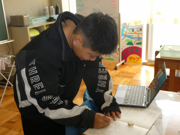 体育は「バスケットボール」。チームの作戦を考えて練習しました。