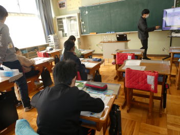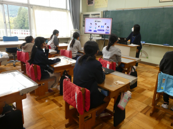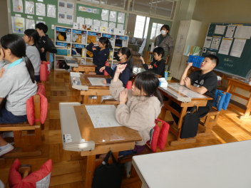 6年生は、ALTに自分で作ったポスターを使って、動物の気持ちや様子を伝えたり、ゲームを通して動物が住んでいる場所や特長を表す英語での言い方を学んだりしました。