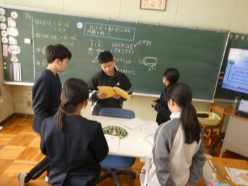 6年生「比」の学習。既習事項を生かし、日常生活に生かす問題。自力で考える時間のあと、学習リーダーが話合いを進め、課題に対するまとめを皆で導き出しました。学習リーダーが友達が発表した意見を黒板に書いて可視化し、話合いをスムーズに進めることができました。