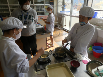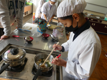 5年生は家庭科で味噌汁を作りました。煮干しや鮎から出汁をとり、栄養バランスを考えて、じゃがいもやさつまいも、さといもなどと別の具材を組み合わせて作りました。味噌の香りが家庭科室に広がりました。「家でも作ってみようかな。」という感想も聞こえてきました。
