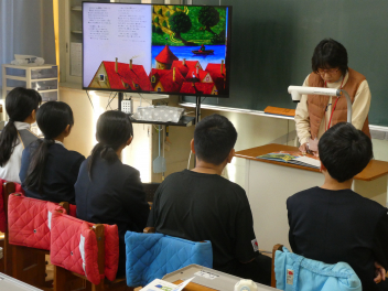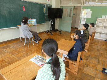 6年生は『ハーメルのふえふき』物語だけでなく、挿絵の魅力を伝えるために提示装置を使って、読み聞かせをしてくださいました。テレビ画面に映し出された絵本の迫力に釘付けの子供たち。読み聞かせが終わったあとの教室でも物語の続きの話題が尽きませんでした。