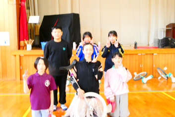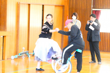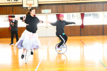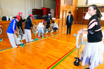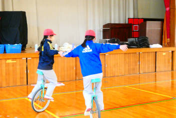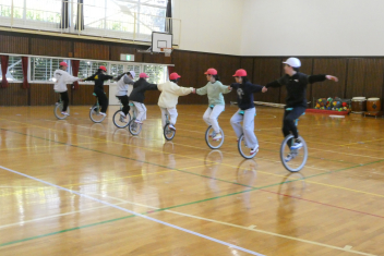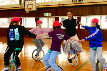 はじめに、模範演技を見せていただきました。一輪車の技術はもちろんのこと、指先から伝わる豊かな表現に魅了された子供たちは、その後の御指導の一つ一つに「できるようになりたい」「近付きたい」と目を輝かせて取り組みました。子供たちの乗り方や技能を見て、個人や集団での演技指導をしてくださり、子供たちは「できる喜び・楽しさ」を実感することができました。