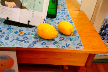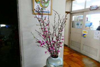 地域の方からいただいた「梅」とレモン。玄関には春が訪れました。近付くと春の香りも。横山小のキャラクター「かなろん」も喜んでいるようです。