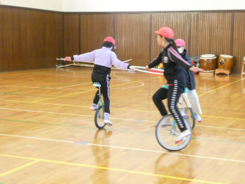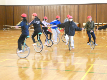 2月12日に指導員の方にきていただき「一輪車教室」を開きます。来年度の運動会の発表につなげられるように、今年度の内容を思い出しながら、練習をしています。