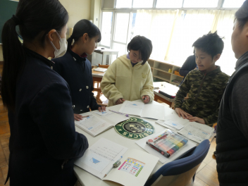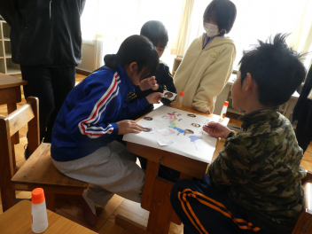 図工では、5年生は「すてきな明かり」、6年生は「卒業記念作品 木彫り工芸箱」を作りました。それぞれが集中して取り組む中、5年生と6年生が完成した作品を一緒に見合う姿がありました。