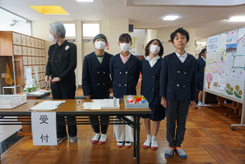 5年生から6年生へお礼の気持ちを込めたプレゼントを贈りました。プレゼントの色紙には、先日の思い出遠足の写真とメッセージが載せられていました。1・2年生のときに撮った写真とほぼ同じ場面で撮った思い出遠足のときの写真を見比べ、歓声があがっていました。