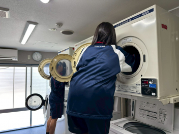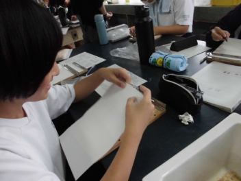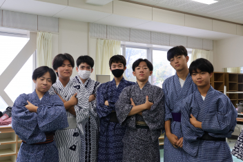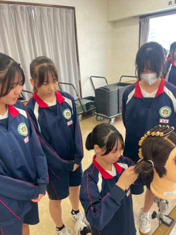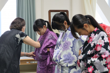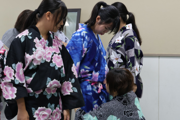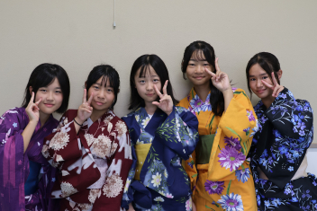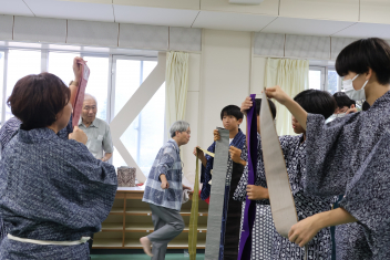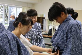 •  2年生の家庭科の授業で、ゆかた着付け教室を行いました。学校運営協議委員の方や保護者の方、ボランティアの方等に御協力いただき、浴衣の着かたを教えていただきました。初めて浴衣を着る生徒も多く、座り方や歩き方の違いに戸惑いながらも楽しく体験することができました。