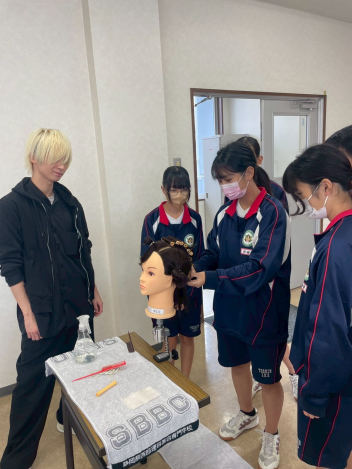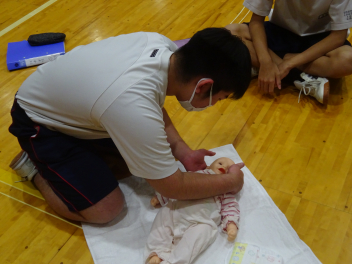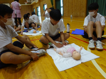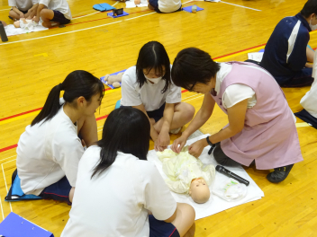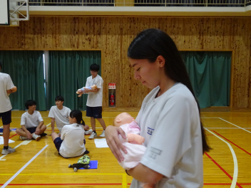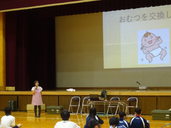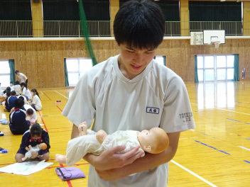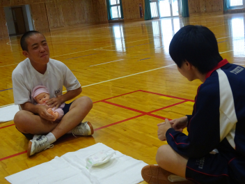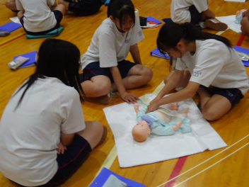 •  保育体験の事前学習で、助産師さんによる講話を聴き、赤ちゃんの抱っこ体験、おむつ交換体験などを行いました。うまく抱っこができて優しい笑顔を見せる生徒や、一人でおむつ交換することが難しく、思ったよりも時間がかかってしまうことに困惑する生徒等、普段あまり味わうことができない、良い体験をすることができました。