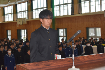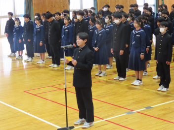 令和7年度修了式を迎え、各学年の代表生徒が1年の振り返りを発表しました。