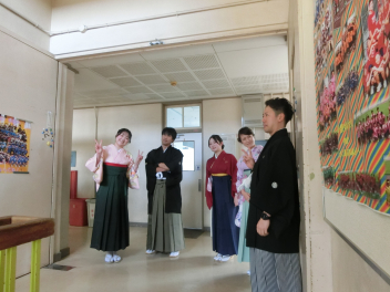 校長からは「1年でみんなが織った布はとても素晴らしくキラキラ輝いていた」「先輩方が織った素晴らしい伝統の布をもとに新しい布を織ってほしい」という話がありました。