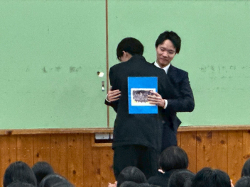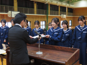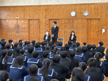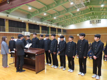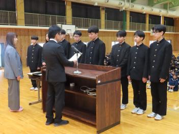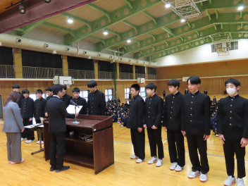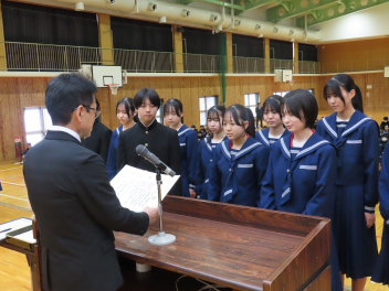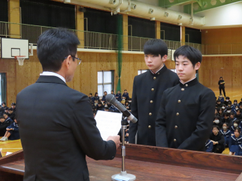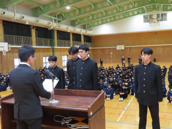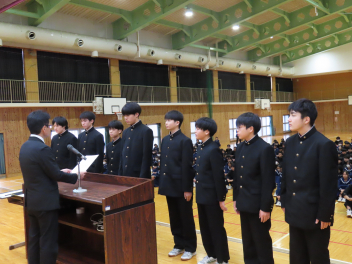 令和7年度修了式を迎え、各学年の代表生徒が1年の振り返りを発表しました。