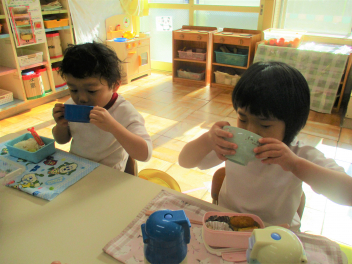 今日は、園庭や室内で好きな遊びを楽しんだ後・・・