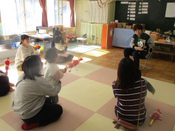 ぽかぽか(預かり保育)の子供たちと一緒に、歌ったり楽器を鳴らしたりして楽しんでいると・・・
