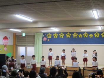 年少さん・年長さんで舞台に上がり、与進幼稚園の園歌を3番まで歌いました元気な歌声が響き、生活発表会が始まりました
