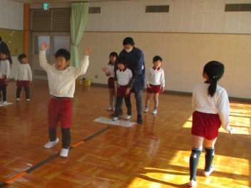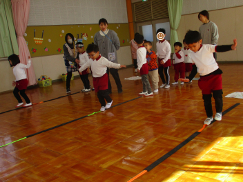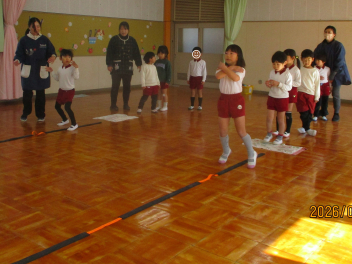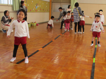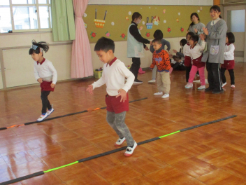 体の様々な部位を順番にタッチしながら進むことにも挑戦しましたジャンプを続けながら手を動かすことは難しかったですが、どの子も自分なりに一生懸命取り組みました