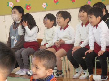 豆まき会では節分についての話を聞き、みんなで『♪まめまき』を歌ったり、『♪赤鬼と青鬼のタンゴ』を踊ったりしました frown