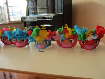 好きな色の鬼を選び、顔のパーツを貼りました髪はお花紙を丸めて貼っていますカラフルで味のある鬼ができあがりましたsad