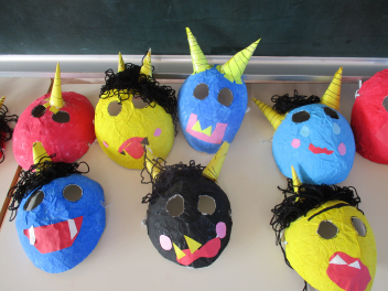 新聞紙や障子紙を貼り重ね、張り子のお面をつくりました被るとあっという間に鬼に変身することができます