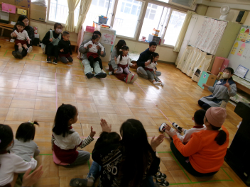 子供たちが聞き馴染みのある曲もたくさん演奏してくださり、『フニクリフニクラ(鬼のパンツ)』では、リズム遊びも取り入れてくださいました