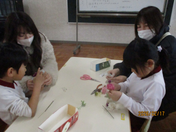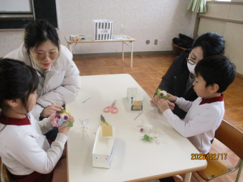 講師の方をお招きし、親子でコサージュづくりをしました年長さんの活動は、『幼稚園特色化推進事業』の一環として取り入れていますlaugh