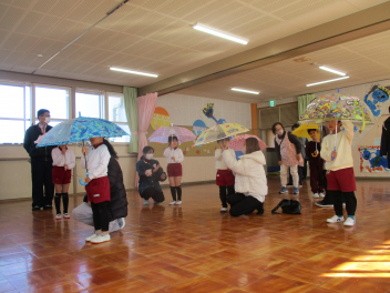 年長さんは、親子で傘の使い方を教えてもらいました