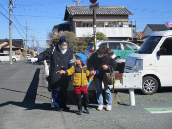 お家の人についてきてもらいながら、一人で道路を歩くことにも挑戦どの子も少し緊張した表情でしたが、最後まで頑張りました