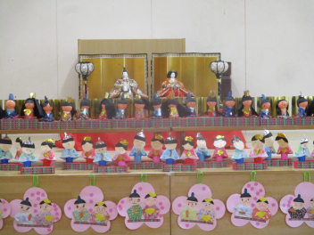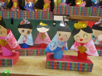子供たちがつくった雛人形が並べられ、とてもきらびやかです