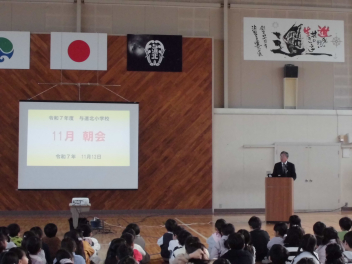 今朝の朝会では、校長先生から「進取」を行った児童の行動が紹介されました。下校中に人助けをした児童、消防車が近づいてきた時、青信号でも立ち止まった児童、下級生に優しく声をかける上級生などのエピソードがありました。