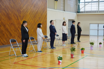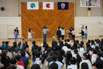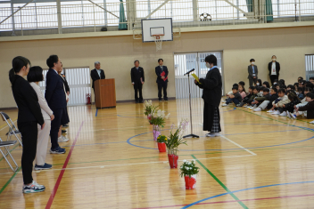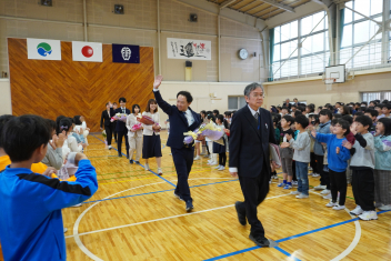 与進北小から6名の先生が離任します。全校の前で、先生方から子供たちへお別れとエールの言葉をいただきました。
