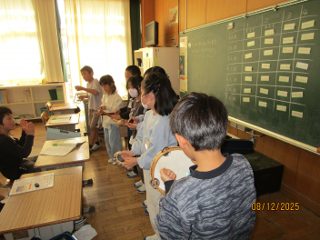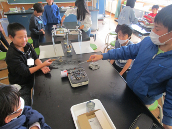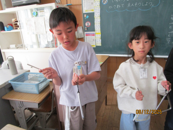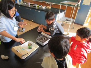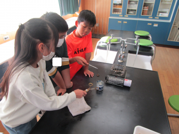 • 理科「ものの温度と体積」の学習にて、金属は温度が変わると体積も変わるかについて実験を通して調べました。カセットコンロを使った実験に緊張しながらも、体積の変化について班で丁寧にまとめていました。