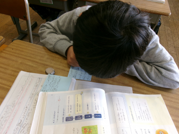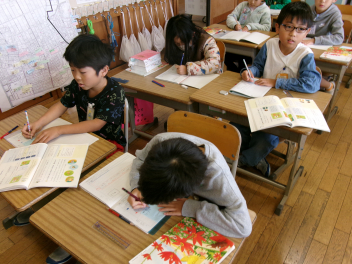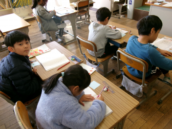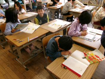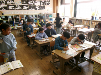 4組の国語科では、国語辞典を使って意味の分からない言葉を調べています。今日は、「おそる、おそる」、