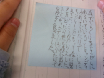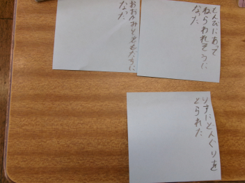 付箋に、自分が考えたお話を書いていきました。子どもたちは、「もっと書きたい」