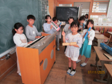 •  音楽会の練習が始まっています。合奏では、分担の楽器が決まり、学級全体で練習をしています。