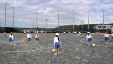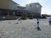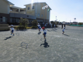 •  体育の授業では、攻めと守りに分かれて、「ボールけりあそび」の試合をしました。