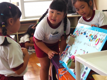明日の遠足に持っていく「お菓子屋さん」も登場しました。どれにしようかな?と考えながら、買い物かごに入れていました。