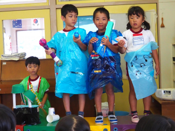 手作り楽器で、楽しい演奏をしてくれる子たちもいました