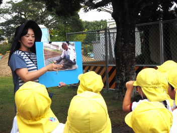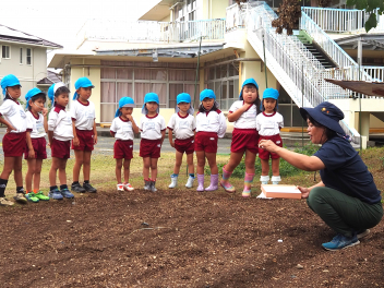 きいぐみさんは玉ねぎの苗の植え方を、一生懸命聞いていました。