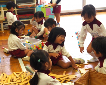 保育室では、友達と「ごっこ遊び」を楽しむ姿が見られます。
