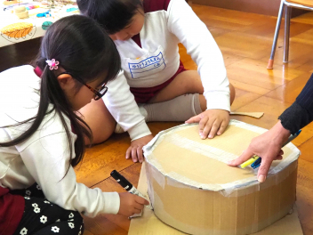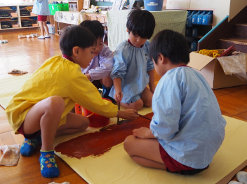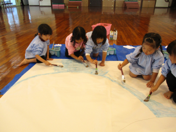 今年度は、発表会のステージ背景を、きいぐみ・あおぐみが合同でつくることになりました。とても大きな模造紙にビックリな子供たちcrying