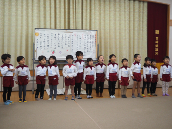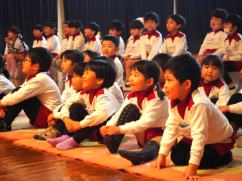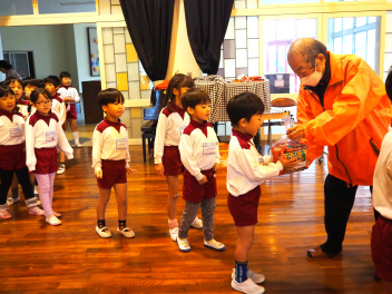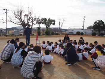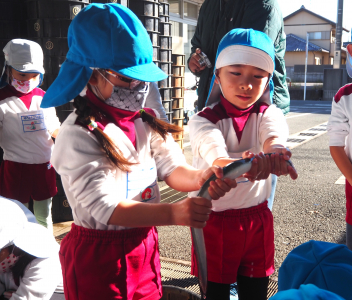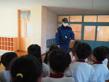 スモーク体験の後、火災の避難訓練を行いました。消防士さんからは火災の時の約束「おはしも」の話を聞きました。