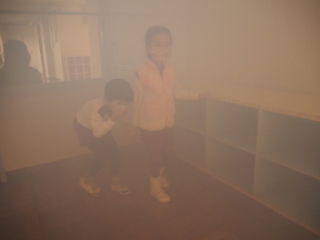 煙がいっぱいの部屋に入る前に、消防士さんからお話を聞きました。「煙は上の方に行くから、みんなはできるだけ背を低くして歩いてね。」